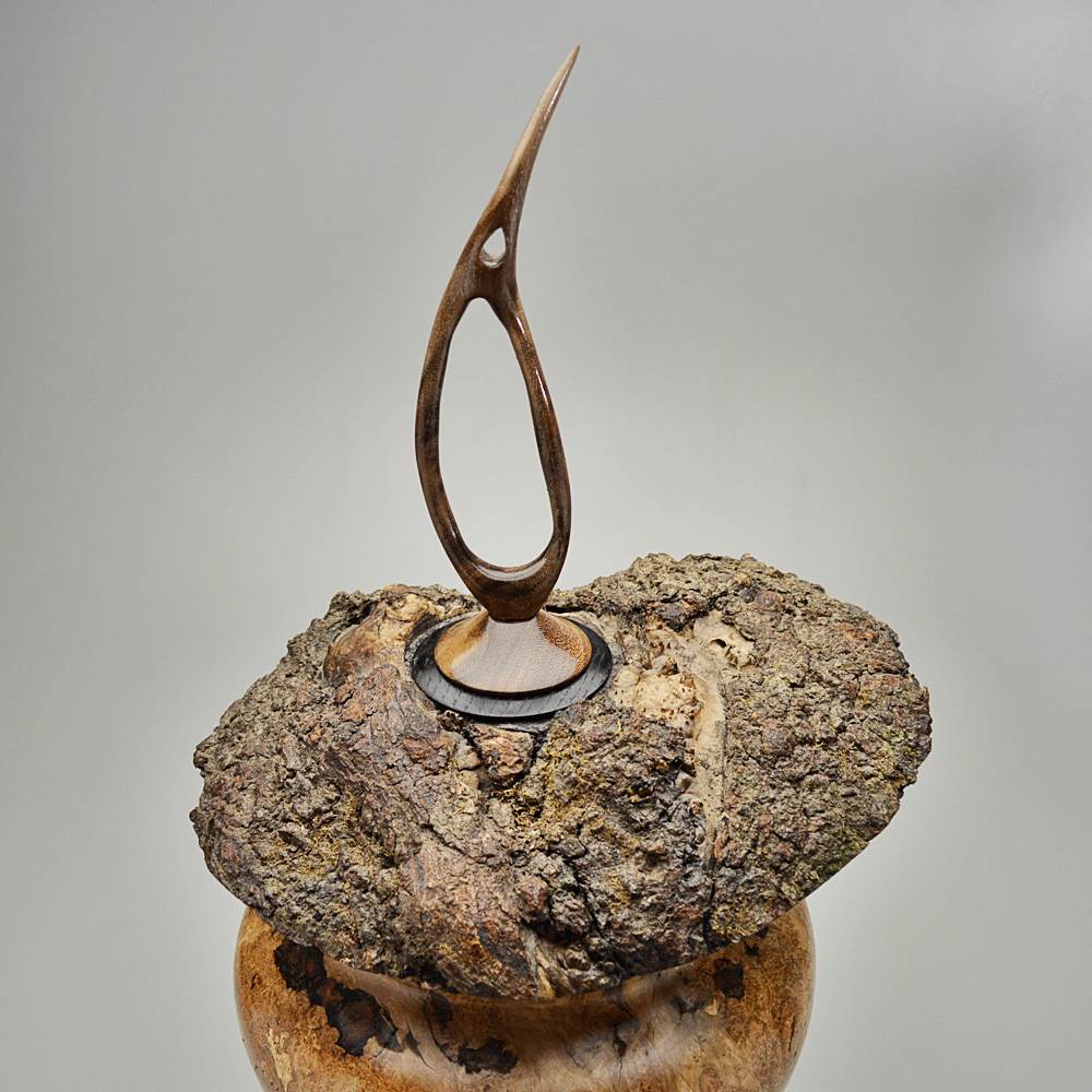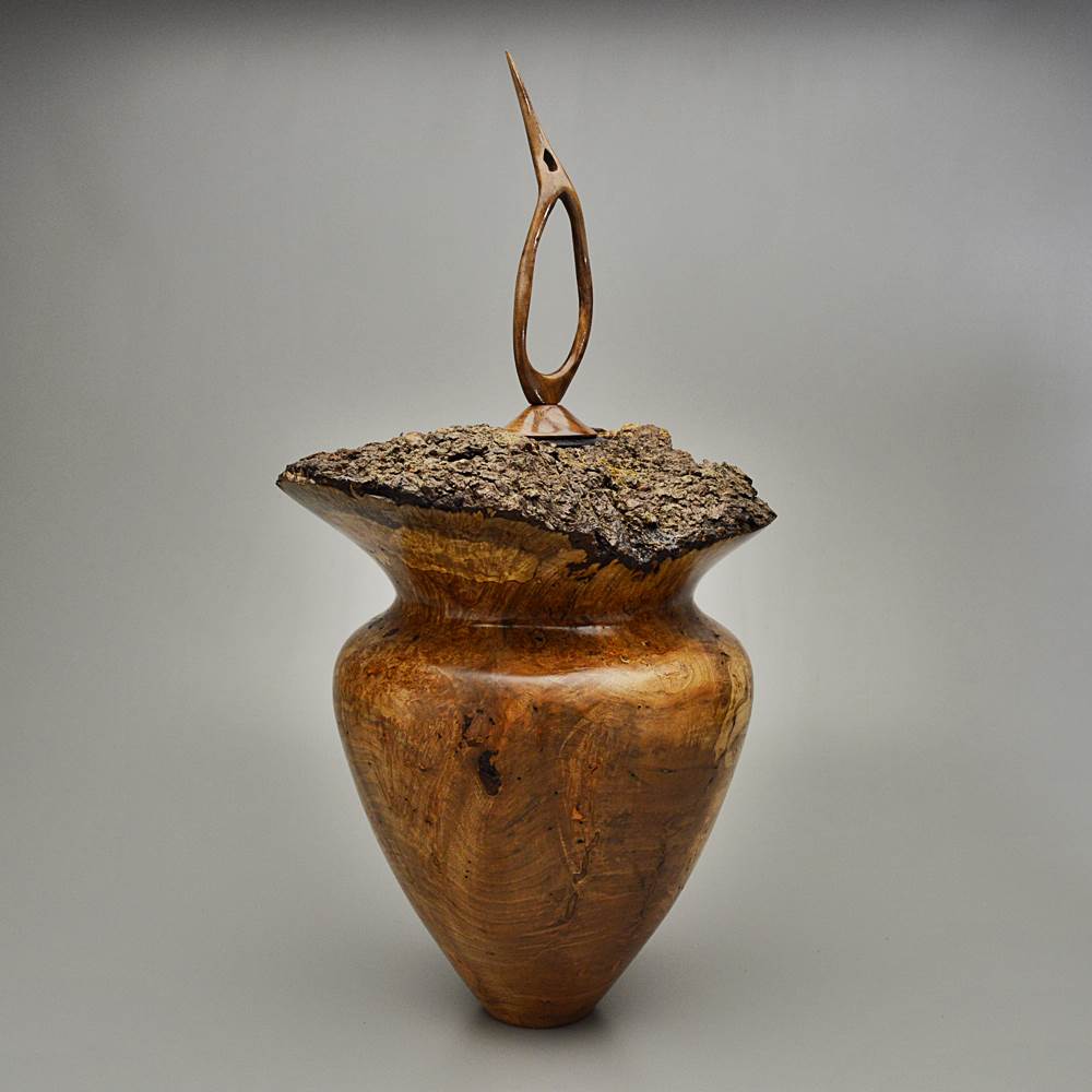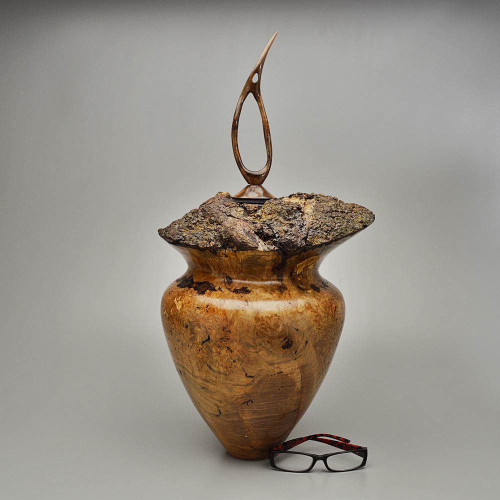 Number:7477350 Style:Fine Art Wood:Maple Burl with Natural Bark Crown Top:Walnut Hand Carved Flame Finial  -  Brass threaded top  -  Reliquery  Capacity: 350 cu. in.  Height: 22.5"   Width: 11.25"