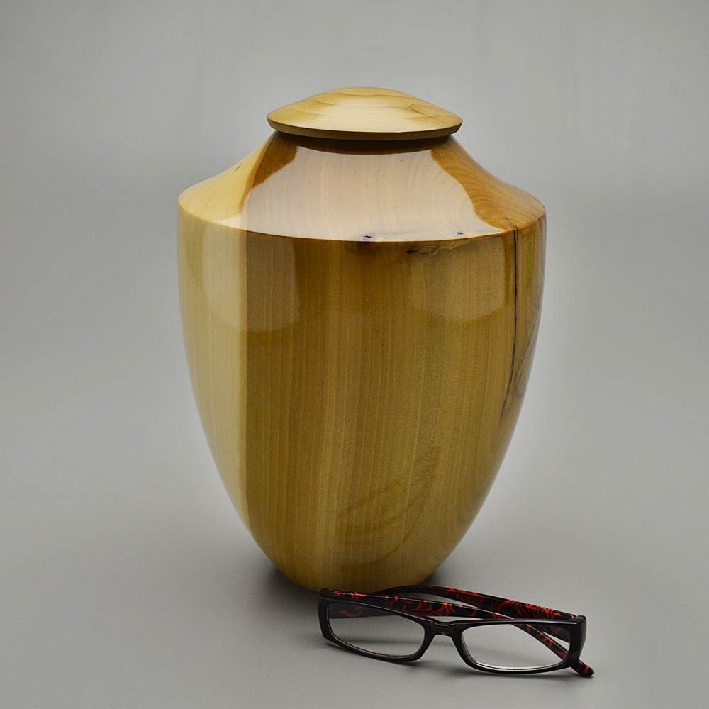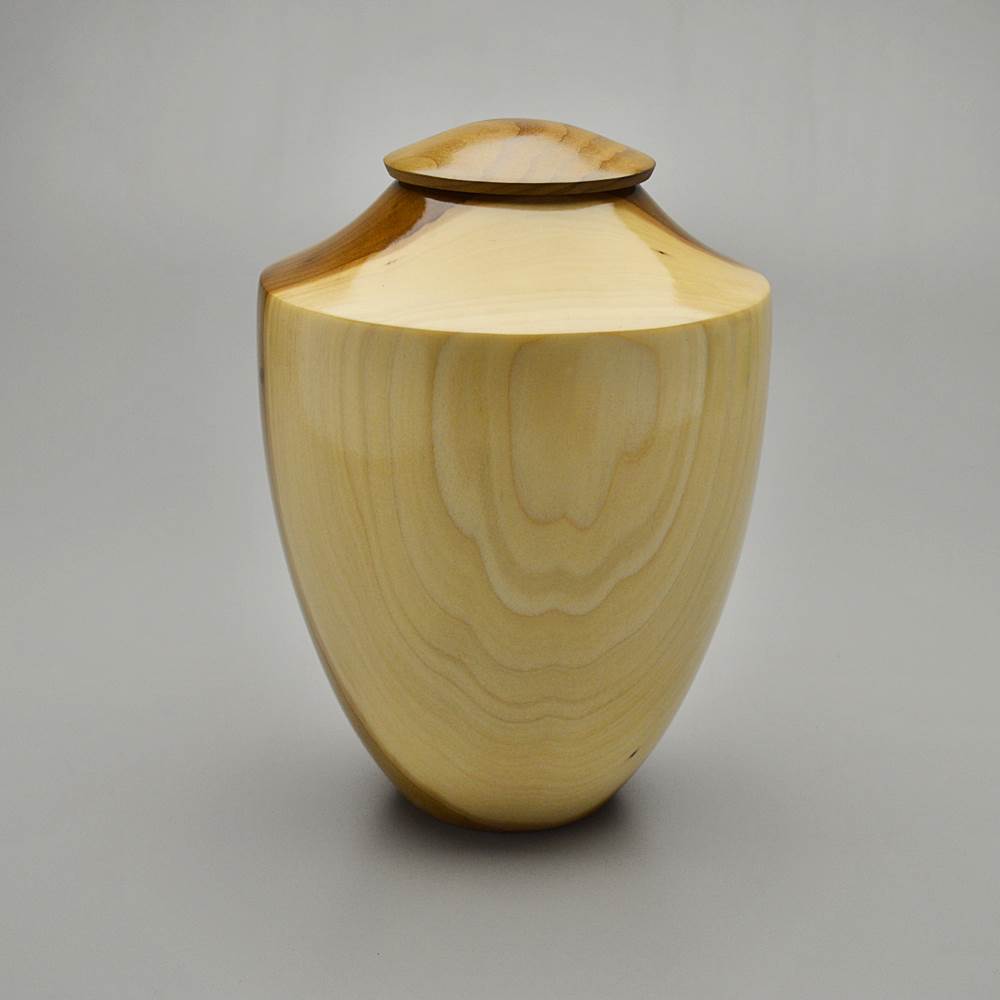 This urn is turned from Tulip Poplar wood. The Poplar is taller than any other U.S. species reaching heights of 160 feet. It grows abundantly throughout the Eastern United States and is commonly used for its qualities as a utility hardwood. The bark, leaves, flowers, fruit and roots contain pharmaceuticals. The sapwood is creamy white versus the contrast of the heartwood varying from yellowish-brown to olive green.