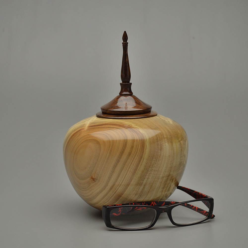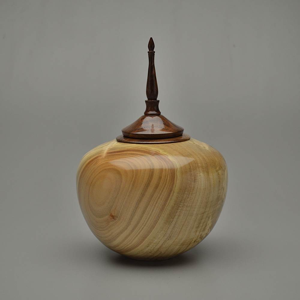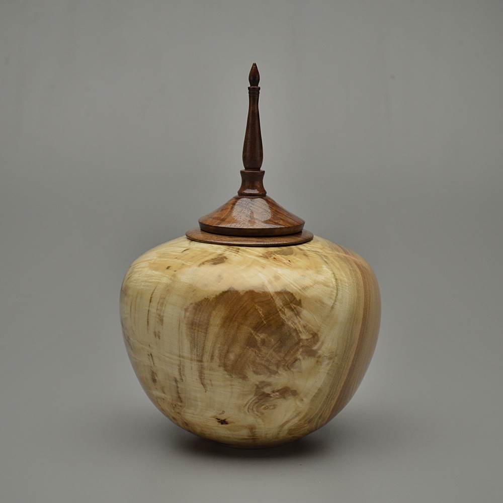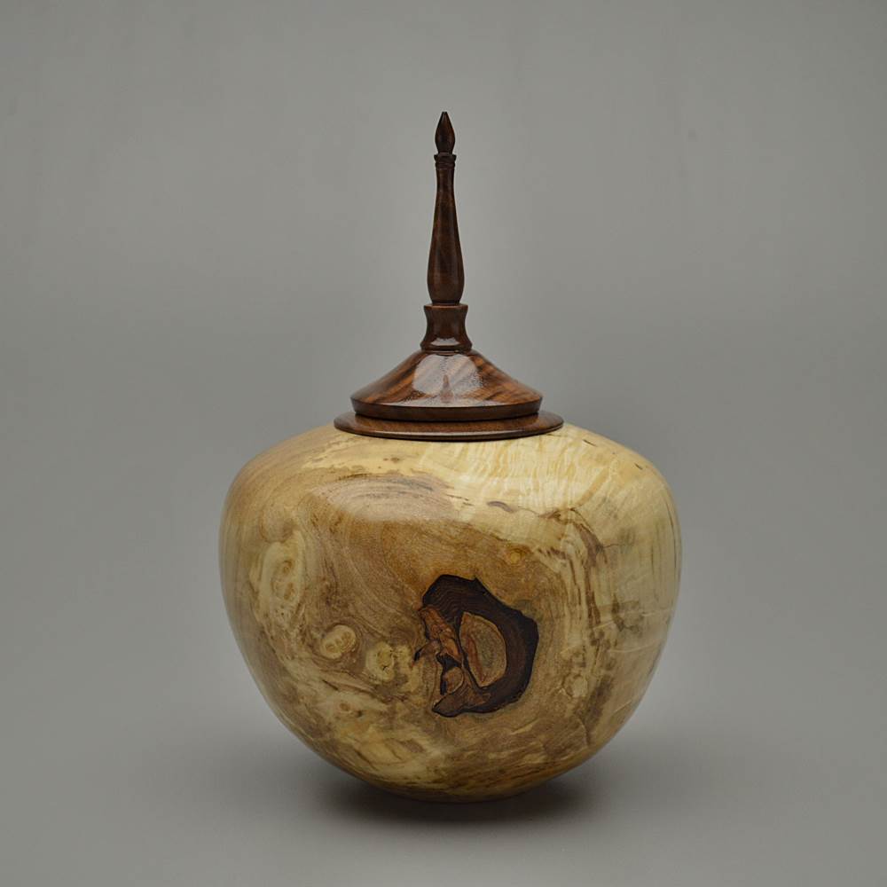 This urn is made from Maple wood, an American favorite. Best known for syrup and displays of red, orange and yellow each fall, Maples grow throughout the Eastern and Central United States. Trees can reach 130 feet tall and the wood color varies from creamy white to grey to reddish-brown depending on the species. This piece is Spalted, a natural breakdown that produces dark contrasting lines creating dramatic figuring with beautiful results. Prized most of all is the Burl in this wood, an explosion of cellular growth, yielding highly figured and unique patterning known for its beauty and rarity.