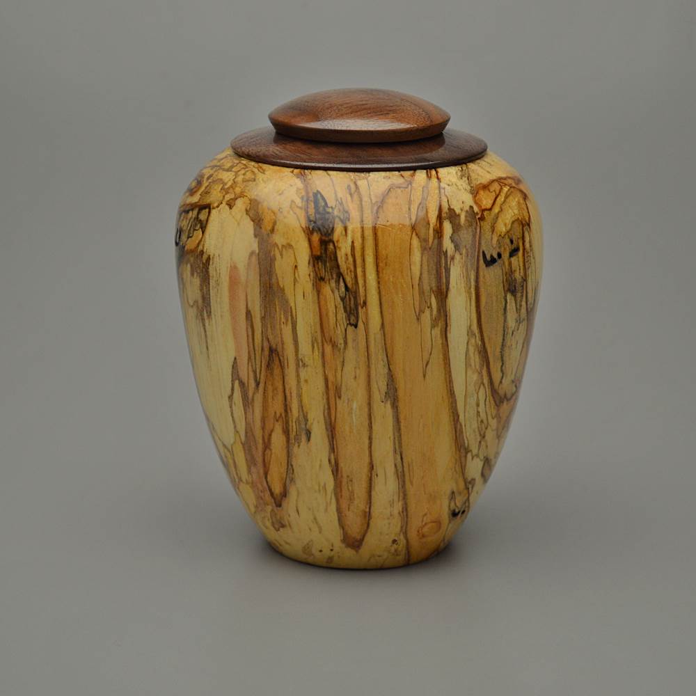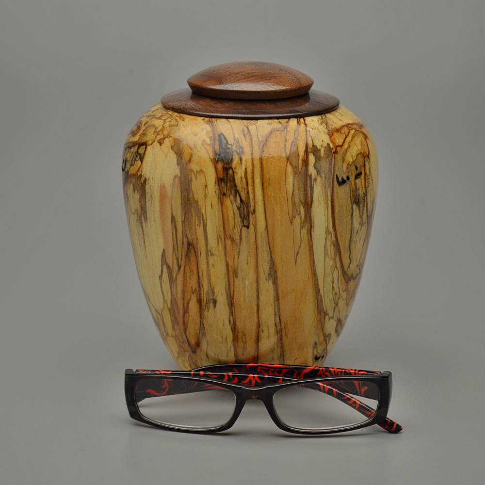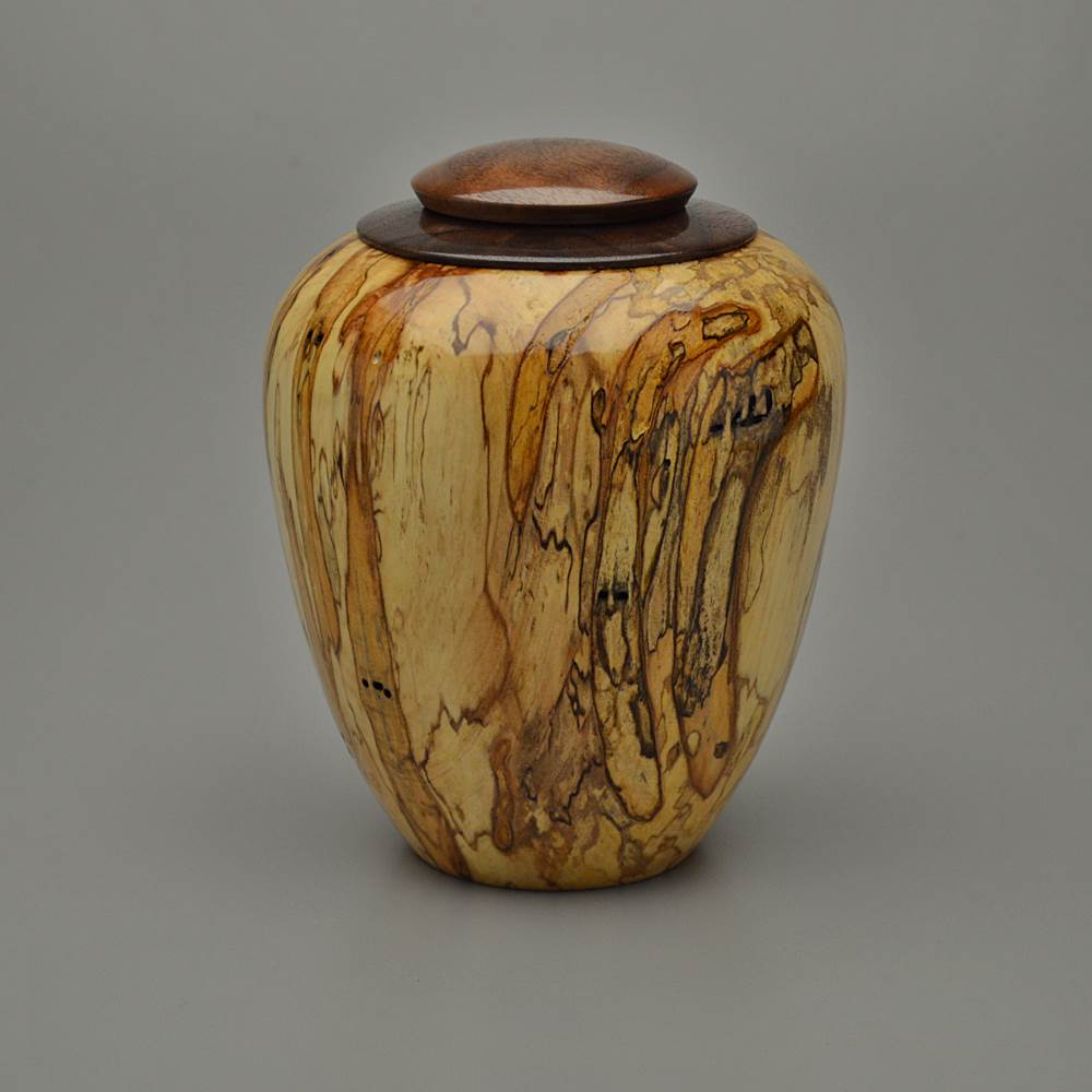 This urn is made from Maple wood, an American favorite. Best known for syrup and displays of red, orange and yellow each fall, Maples grow throughout the Eastern and Central United States. Trees can reach 130 feet tall and the wood color varies from creamy white to grey to reddish-brown depending on the species. This piece exhibits decorative design in the wood as a result of the Ambrosia beetle. Appropriately referred to as Ambrosia Maple, this wood is highly sought after for wood turning.