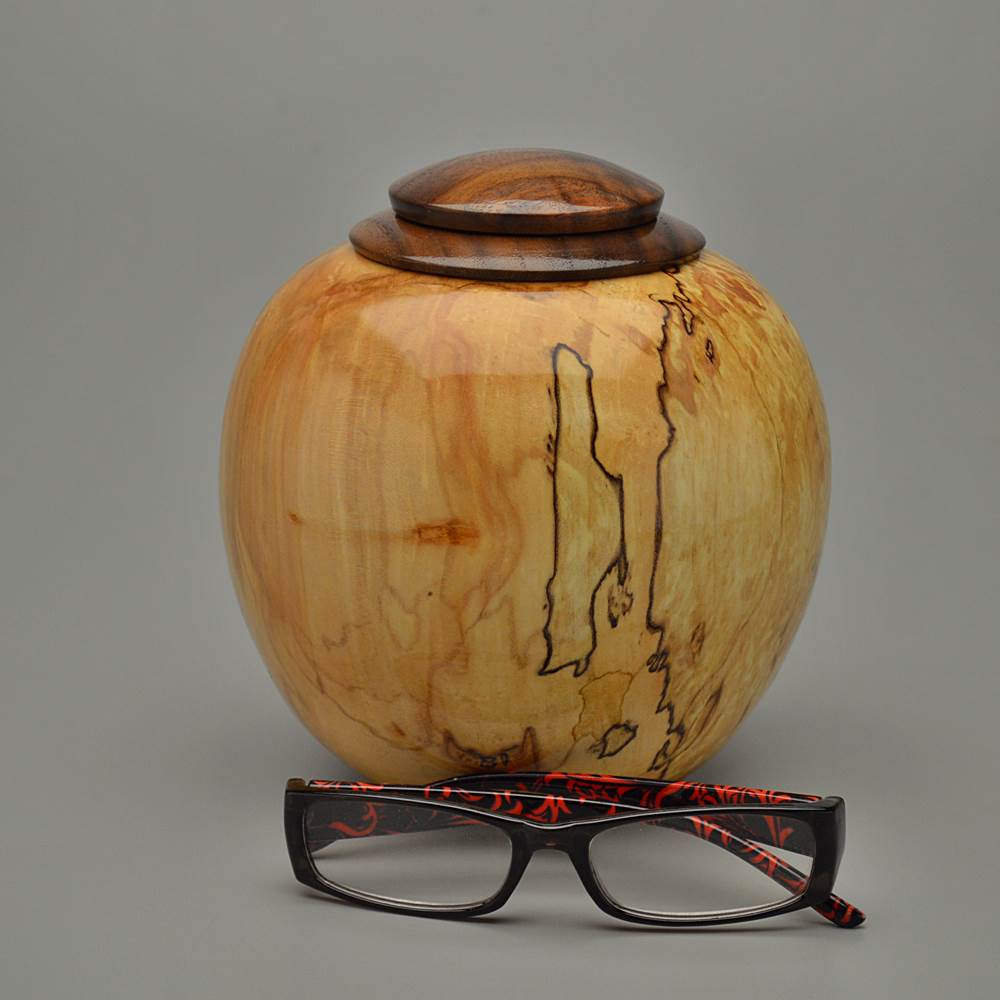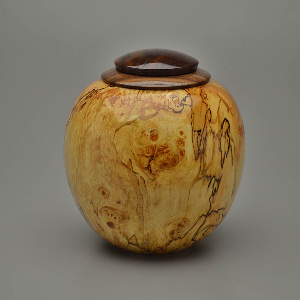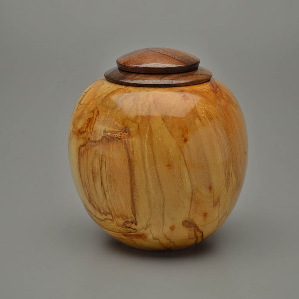 This urn is made from Maple wood, an American favorite. Best known for syrup and displays of red, orange and yellow each fall, Maples grow throughout the Eastern and Central United States. Trees can reach 130 feet tall and the wood color varies from creamy white to grey to reddish-brown depending on the species. This piece includes Burl wood, an explosion of cellular growth, which yields highly figured and unique patterning prized for its beauty and rarity.