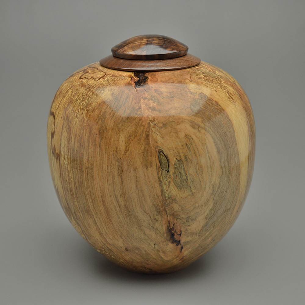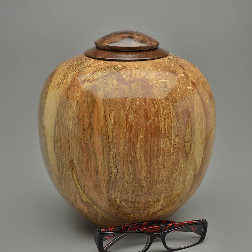 This urn is made from Maple wood, an American favorite. Best known for syrup and displays of red, orange and yellow each fall, Maples grow throughout the Eastern and Central United States. Trees can reach 130 feet tall and the wood color varies from creamy white to grey to reddish-brown depending on the species. This piece exhibits decorative design in the wood as a result of the Ambrosia beetle. Appropriately referred to as Ambrosia Maple, this wood is highly sought after for wood turning.