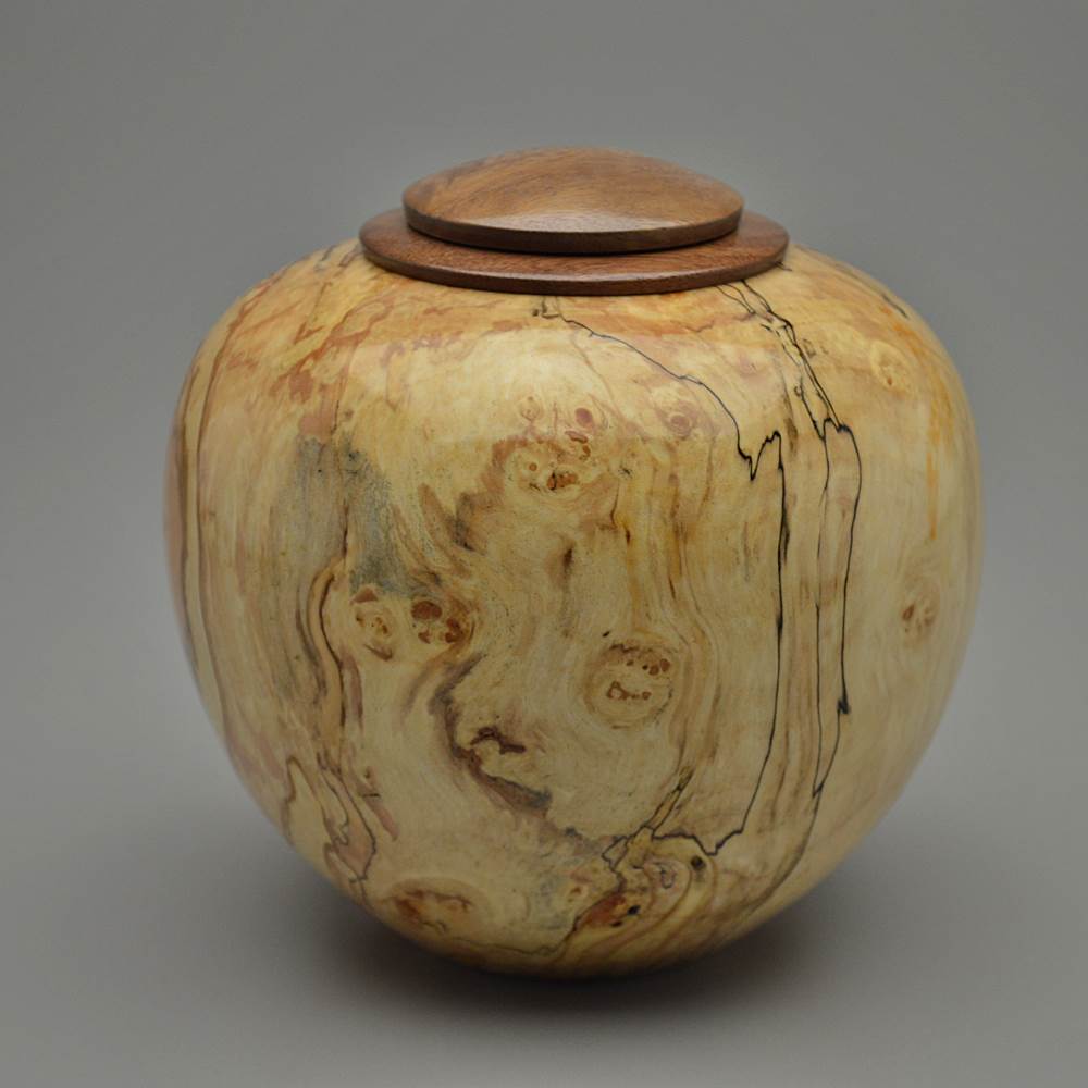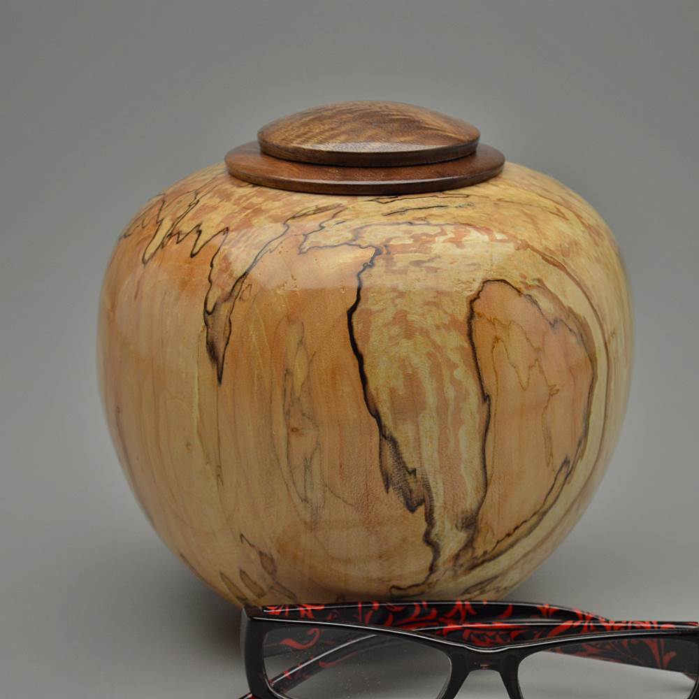 This urn is made from Maple wood, an American favorite. Best known for syrup and displays of red, orange and yellow each fall, Maples grow throughout the Eastern and Central United States. Trees can reach 130 feet tall and the wood color varies from creamy white to grey to reddish-brown depending on the species. This piece includes Burl wood, an explosion of cellular growth, which yields highly figured and unique patterning prized for its beauty and rarity.