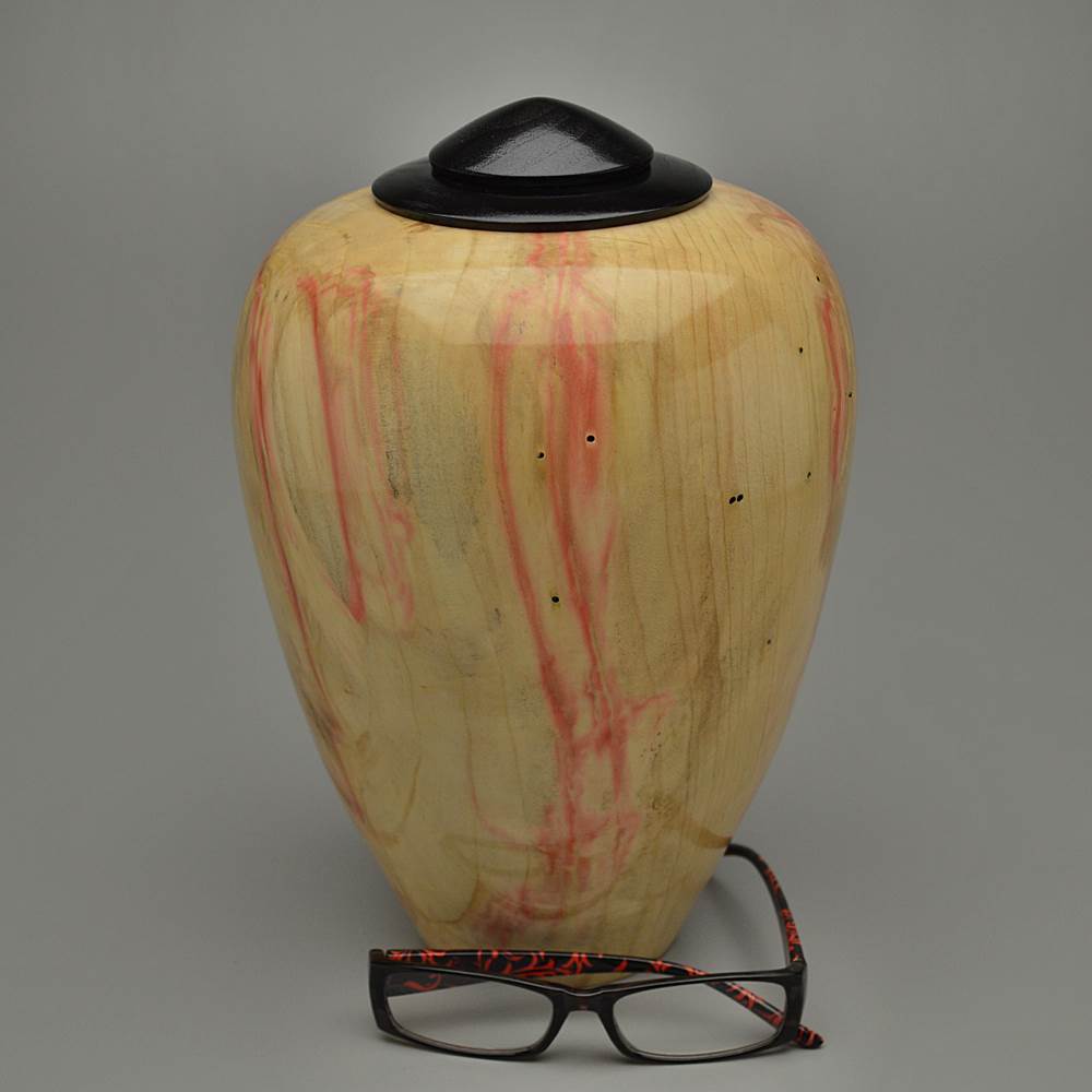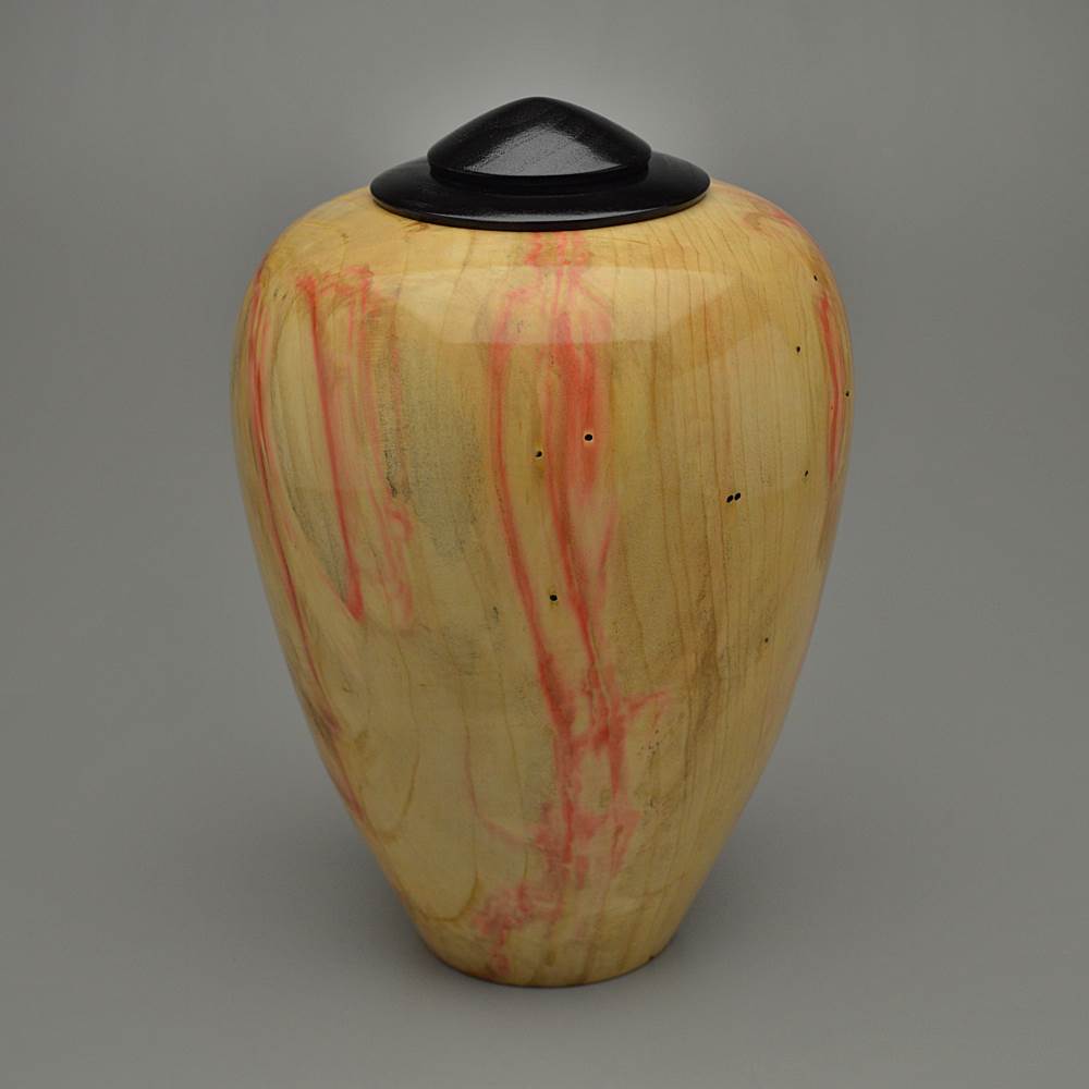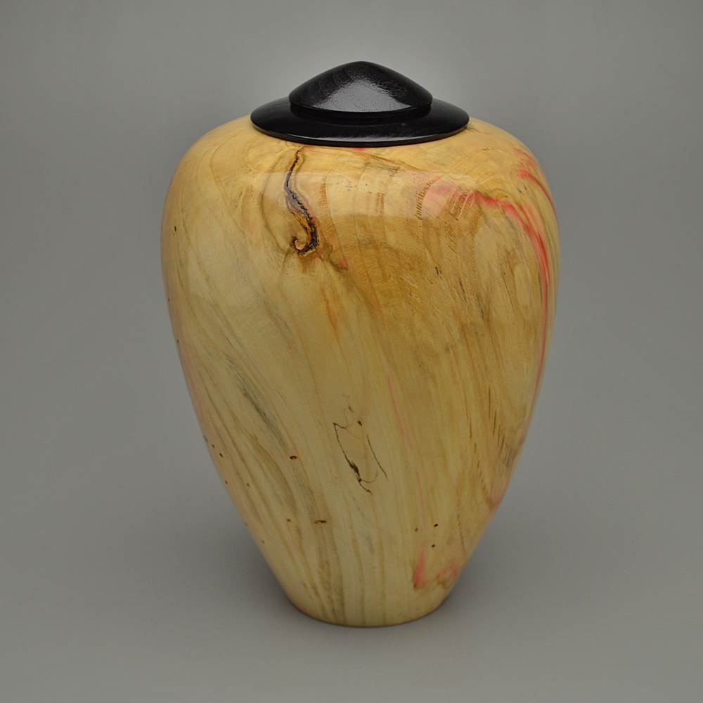 This urn is made of Box Elder wood. Actually a Maple species, it got its name from the wood being similar to boxwood and the leaf to that of the elder. The oldest flutes from the Americas were made of Box Elder. Native Americans used it to make sugar for candies, charcoal for ceremonial painting, tubes for bellows and incense for spiritual medicines. Usually a small, fast-growing and fairly short-lived tree, it grows from 30 to 80 feet tall. Its natural range is from the Atlantic Coast to the Rocky Mountains. Known for its red stain, it is prized for various decorative applications, such as turned items.