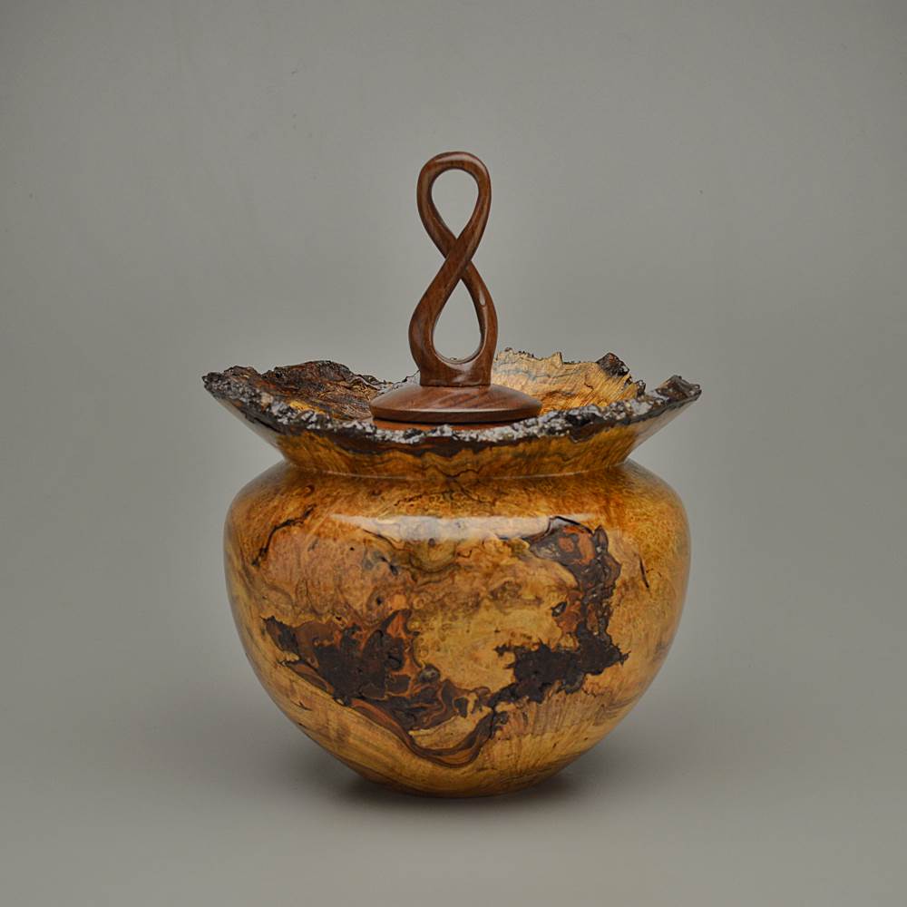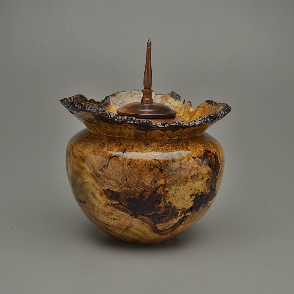 This urn is made from Maple wood, an American favorite. Best known for syrup and displays of red, orange and yellow each fall, Maples grow throughout the Eastern and Central United States. Trees can reach 130 feet tall and the wood color varies from creamy white to grey to reddish-brown depending on the species. This piece includes Burl wood, an explosion of cellular growth, which yields highly figured and unique patterning prized for its beauty and rarity.