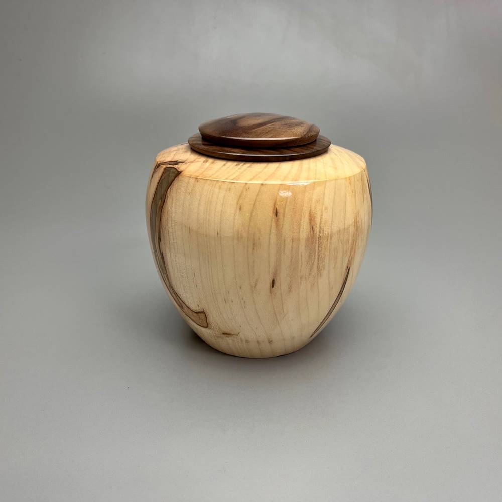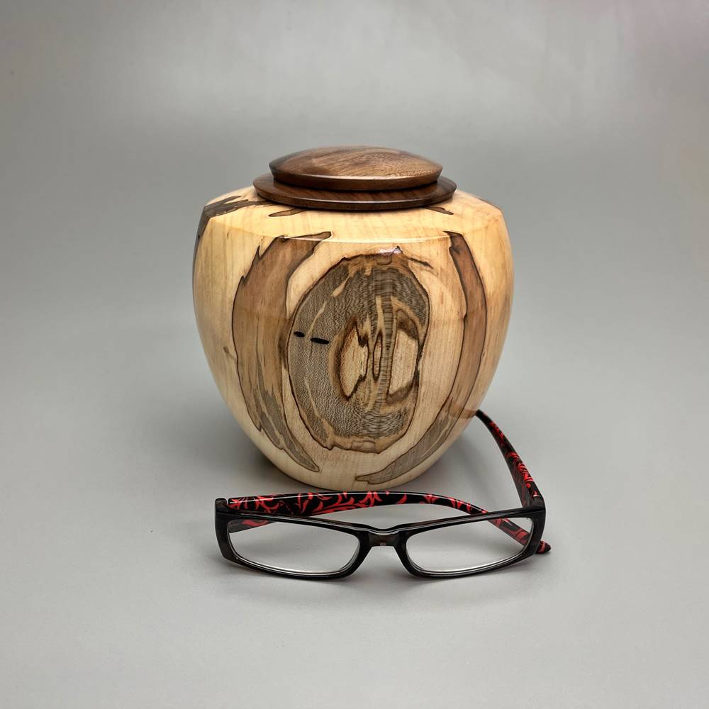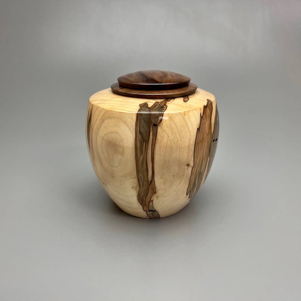 This urn is made from Maple wood, an American favorite. Best known for syrup and displays of red, orange and yellow each fall, Maples grow throughout the Eastern and Central United States. Trees can reach 130 feet tall and the wood color varies from creamy white to grey to reddish-brown depending on the species. This piece exhibits decorative design in the wood as a result of the Ambrosia beetle. Appropriately referred to as Ambrosia Maple, this wood is highly sought after for wood turning.