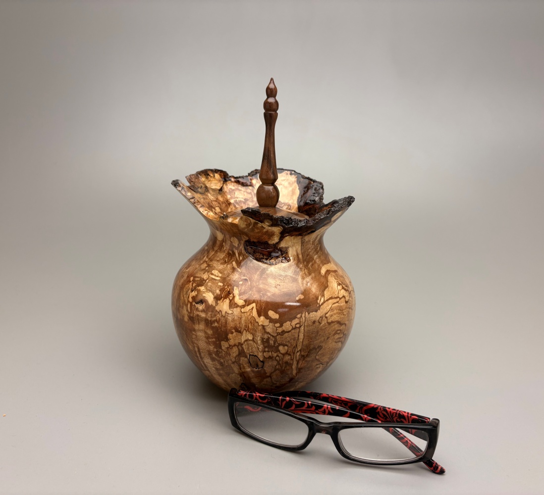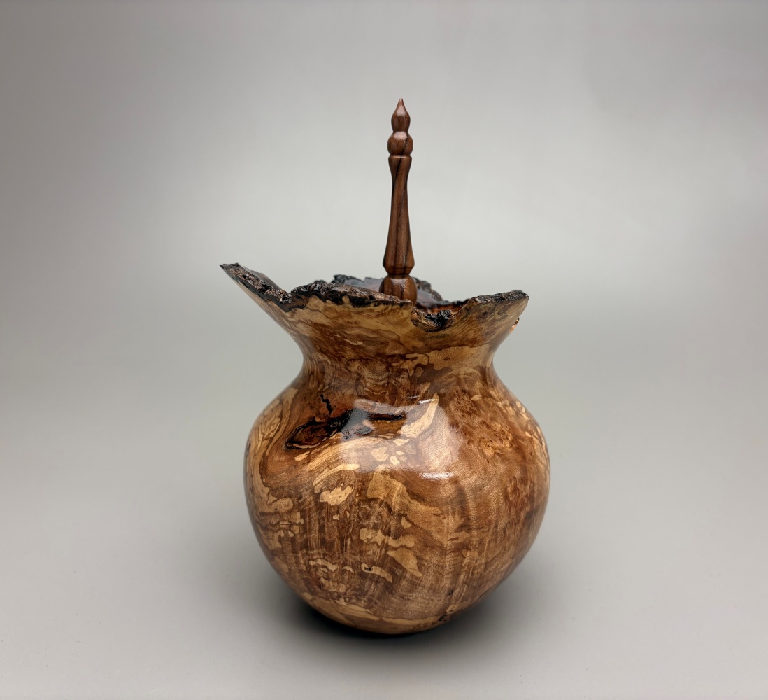 This urn is made from Maple wood, an American favorite. Best known for syrup and displays of red, orange and yellow each fall, Maples grow throughout the Eastern and Central United States. Trees can reach 130 feet tall and the wood color varies from creamy white to grey to reddish-brown depending on the species. This piece is Spalted, a natural breakdown that produces dark contrasting lines creating dramatic figuring with beautiful results.