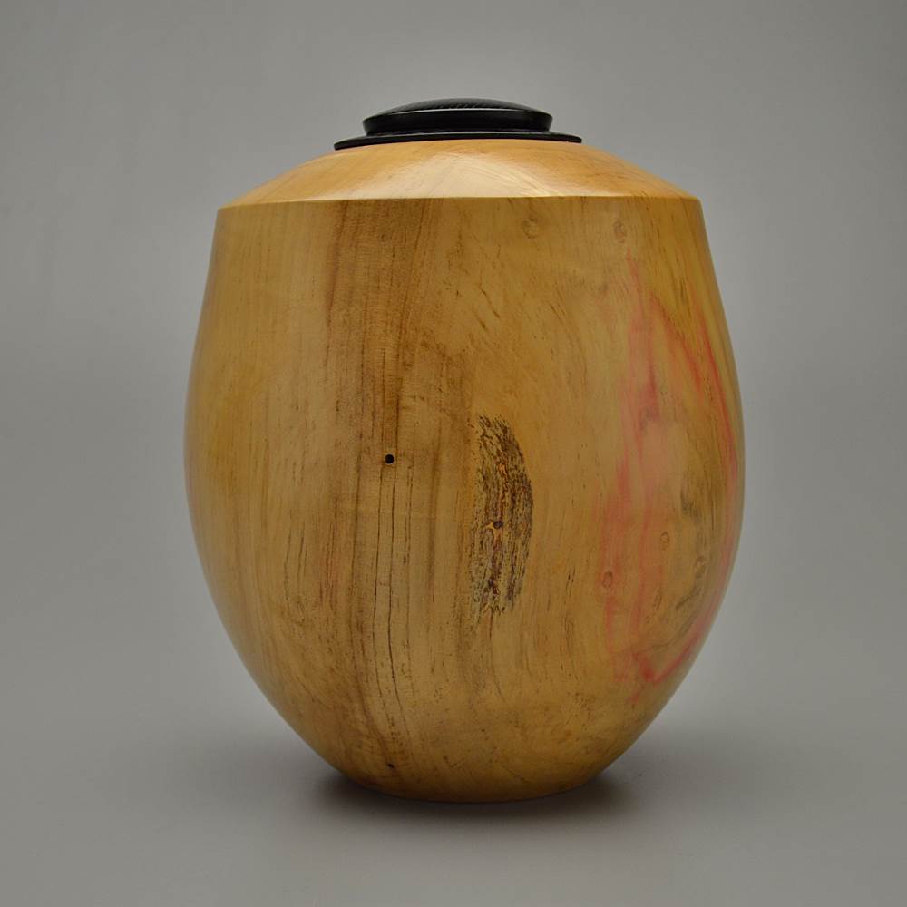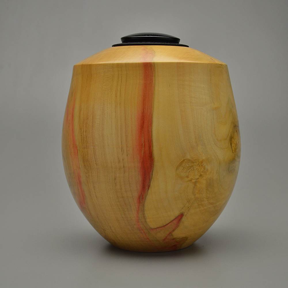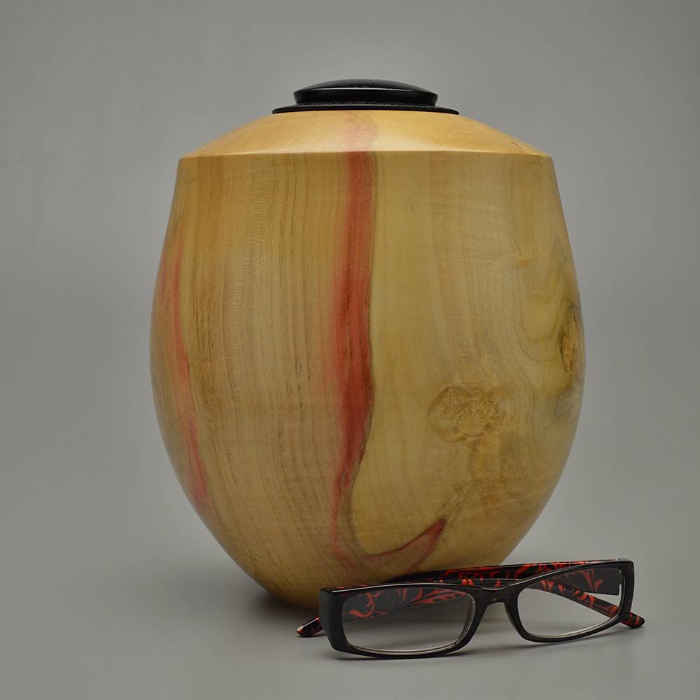 This urn is made of Box Elder wood. Actually a Maple species, it got its name from the wood being similar to boxwood and the leaf to that of the elder. The oldest flutes from the Americas were made of Box Elder. Native Americans used it to make sugar for candies, charcoal for ceremonial painting, tubes for bellows and incense for spiritual medicines. Usually a small, fast-growing and fairly short-lived tree, it grows from 30 to 80 feet tall. Its natural range is from the Atlantic Coast to the Rocky Mountains. Known for its red stain, it is prized for various decorative applications, such as turned items.